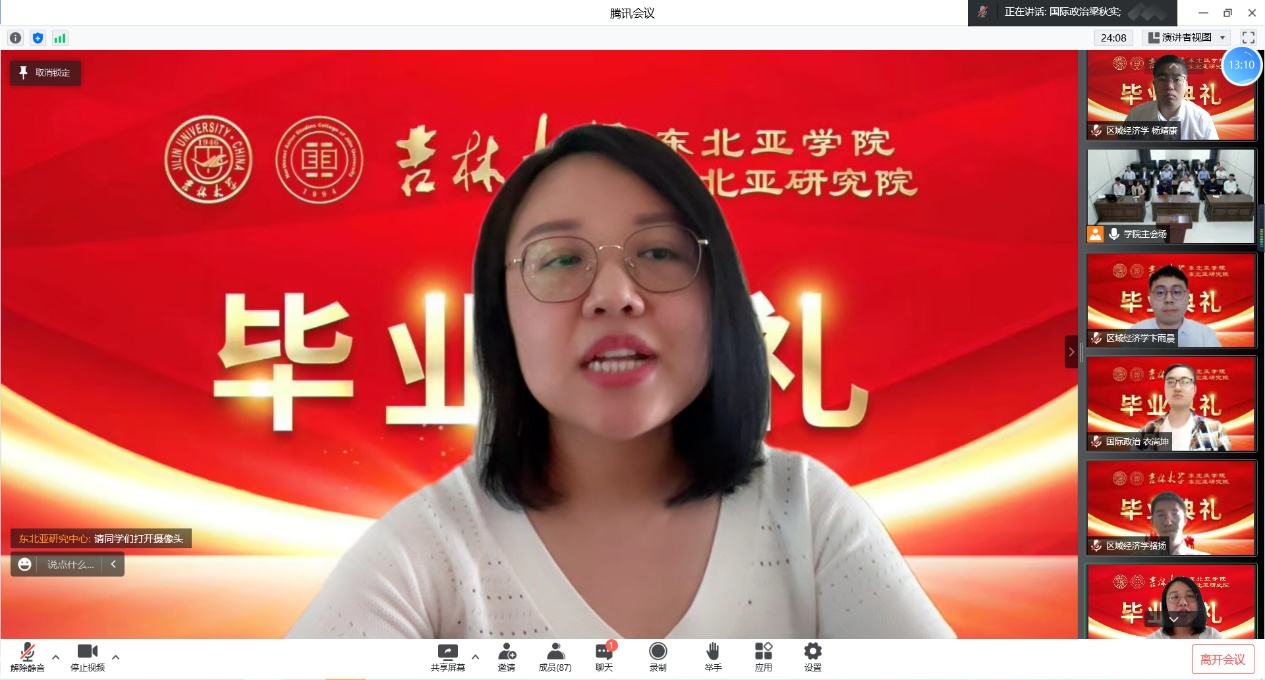 Liang Qiushi, representative of doctoral graduates, and Bian Yuchen, representative of master's graduates, expressed their gratitude to the college and teachers and their reluctance to part with fellow classmates, and said that they would keep in mind the JLU motto of "Truth· Innovation· Aspiration" and the patient instructions of teachers, and that no matter where they go in the future, they will show the world with the demeanor of students of Jilin University and Northeast Asian Studies College.