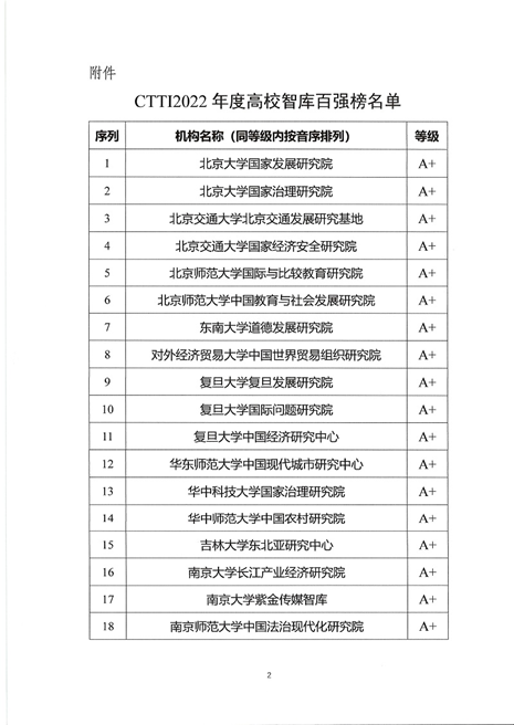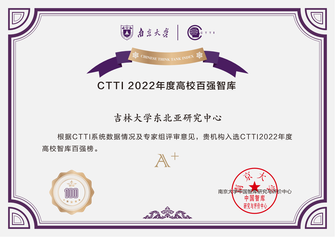 On December 17th, 2022, the 2022 New Think Tank Administration Forum, co-hosted by Nanjing University and Jiangsu Provincial Academy of Social Sciences, released the CTTI’s list of Top 100 Colleges Think Tanks in 2022, and the Northeast Asian Research Center of Jilin University was selected as one of the "A+" Think Tanks.