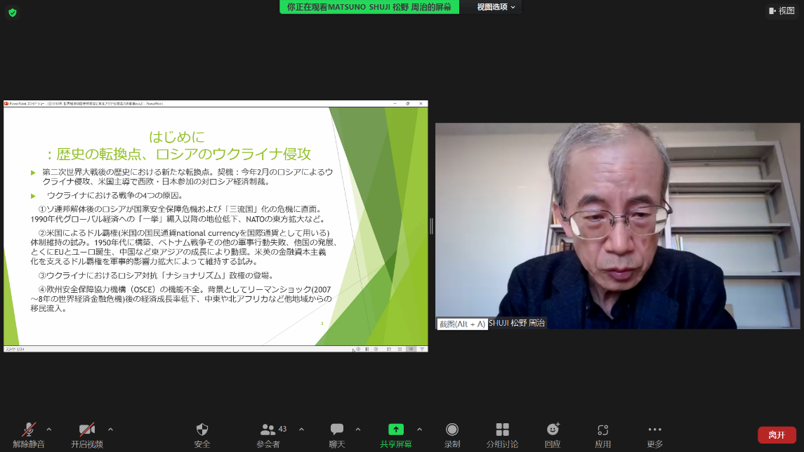 On December 9th, 2022, MATSUNO SHUJI, Professor Emeritus of the College of Economics at Ritsumeikan University, delivered an online keynote lecture on “Sino-Japanese 50 Years – The Historical Transformation of World Economy and the Significance of Regional Cooperation in Northeast Asia”, at the invitation of the Northeast Asian Research Center of Jilin University (JLU), the Northeast Asian Studies College of JLU, the Institute of Japanese Studies of JLU and Special Committee for Northeast Asian Regional Studies, Academic Association for International Cultural Exchange. The lecture was presided over by Associate Professor Wang Yanjun, Vice Dean of the Northeast Asian Studies College of Jilin University.