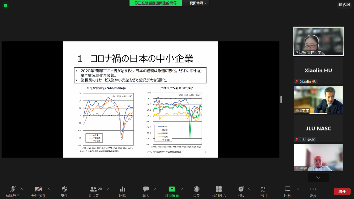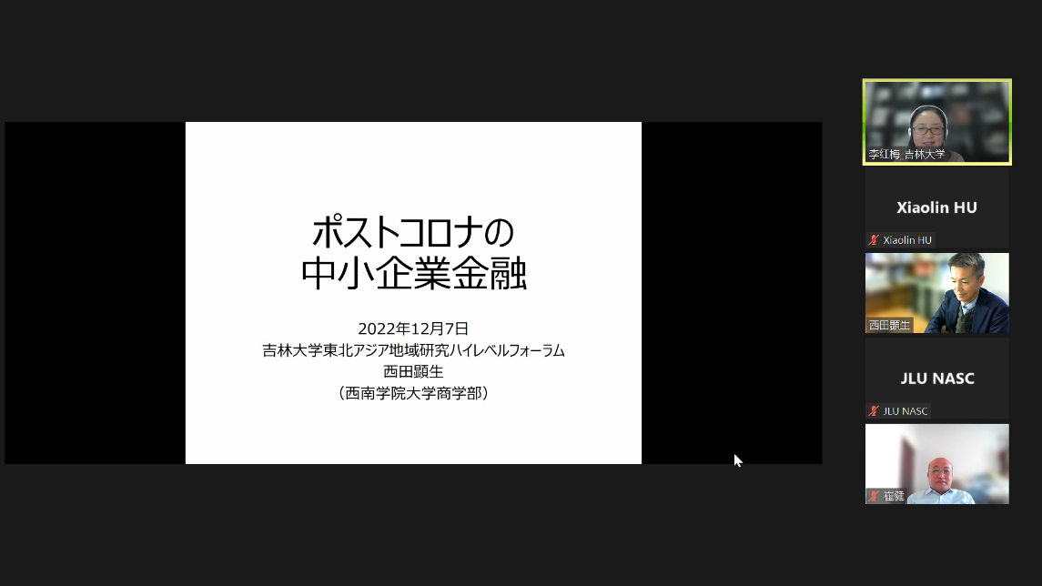 On December 7th, 2022, Professor NISHIDA AKIO, Dean of the Faculty of Commerce of Seinan Gakuin University, Japan, delivered an online lecture on "SME Financing in the Post-Pandemic Era” at the invitation of the Northeast Asian Research Center of Jilin University, the Northeast Asian Studies College of Jilin University, the Institute of Japanese Studies of Jilin University, and the Special Committee for Northeast Asian Regional Studies, Academic Association for International Cultural Exchange. The lecture was hosted by Associate Professor Li Hongmei, Deputy Director of the Institute of World Economics, Northeast Asian Studies College of Jilin University.