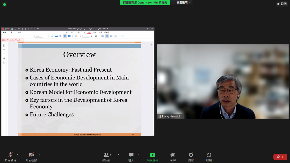 In the first part of the lecture, Pro. Kim selected indicators such as GDP growth rate, inflation rate, investment savings rate, and unemployment rate to describe the development of the Korean economy; in the second part of the lecture, Pro. Kim showed that Korea's development cannot be achieved without the support of economic policies and pointed out that each developing country must choose its own development path according to its own national conditions; in the last part, Prof. Kim introduced the challenges for the future development of the Korean economy, namely, the aging population will have a negative impact on the Korean economy.