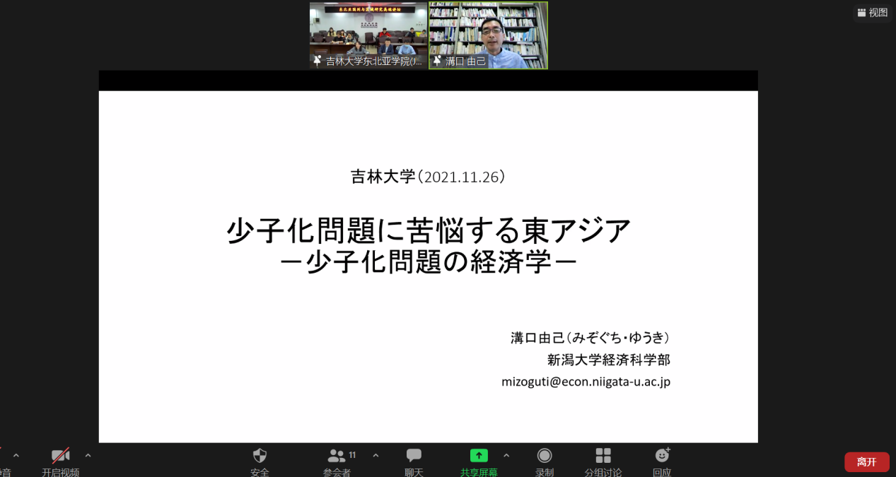 On November 26th, 2021, an online academic conference was held with the theme of “A Brief Discussion on East Asia’s Major Problem: Sub-replacement Fertility” by Professor Yuuki Mizoguchi of the Faculty of Economic Sciences of Niigata University, at the invitation of the Northeast Asian Research Center of Jilin University and the Northeast Asian Studies College of Jilin University. Associate Professor Wang Yanjun, Vice Dean of the Northeast Asian Studies College of Jilin University, presided over the conference. Mr. Shen He served as an interpreter. Postgraduates majoring in demography and faculty and students of related majors both on and off campus took part in the event in person or online.