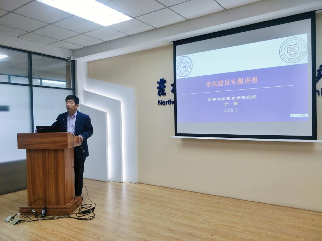 2018年8月27日上午,为了加强对学生全面素质的培养,提高学生的思想道德素质,东北亚研究院在东荣大厦215会议室召开了2018级科学道德与学风建设讲座。本次讲座由于潇院长主讲,2018级全体硕士新生参加。
