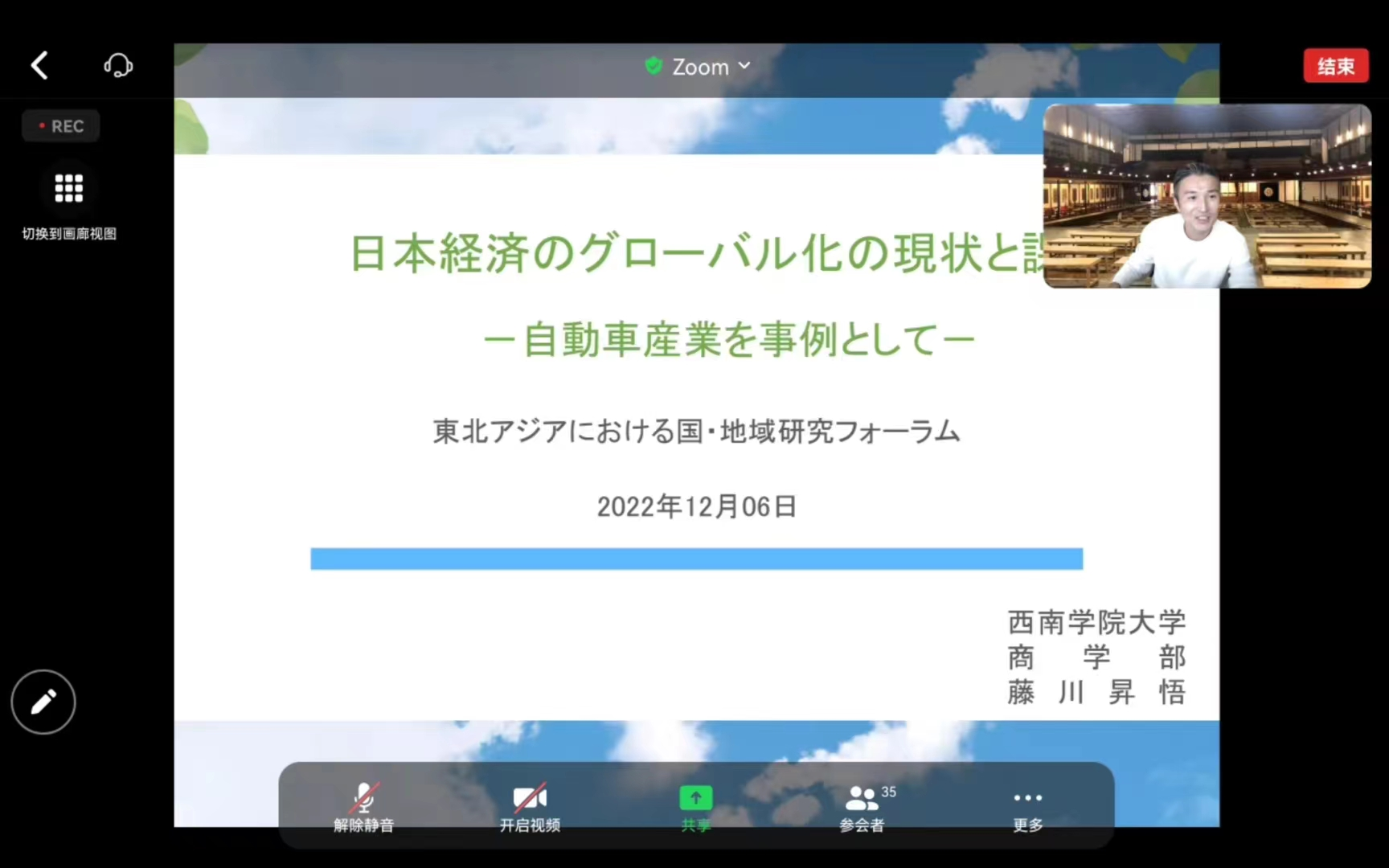 日本研究所、国际文化交流学术联盟东北亚区域研究专门委员会的邀请,日本西南学院大学商学部藤川升悟 (FUJIKAWA SHOGO)教授举行了以“日本经济全球化的现状与问题”为主题的线上讲座。本次讲座由Ohentai
