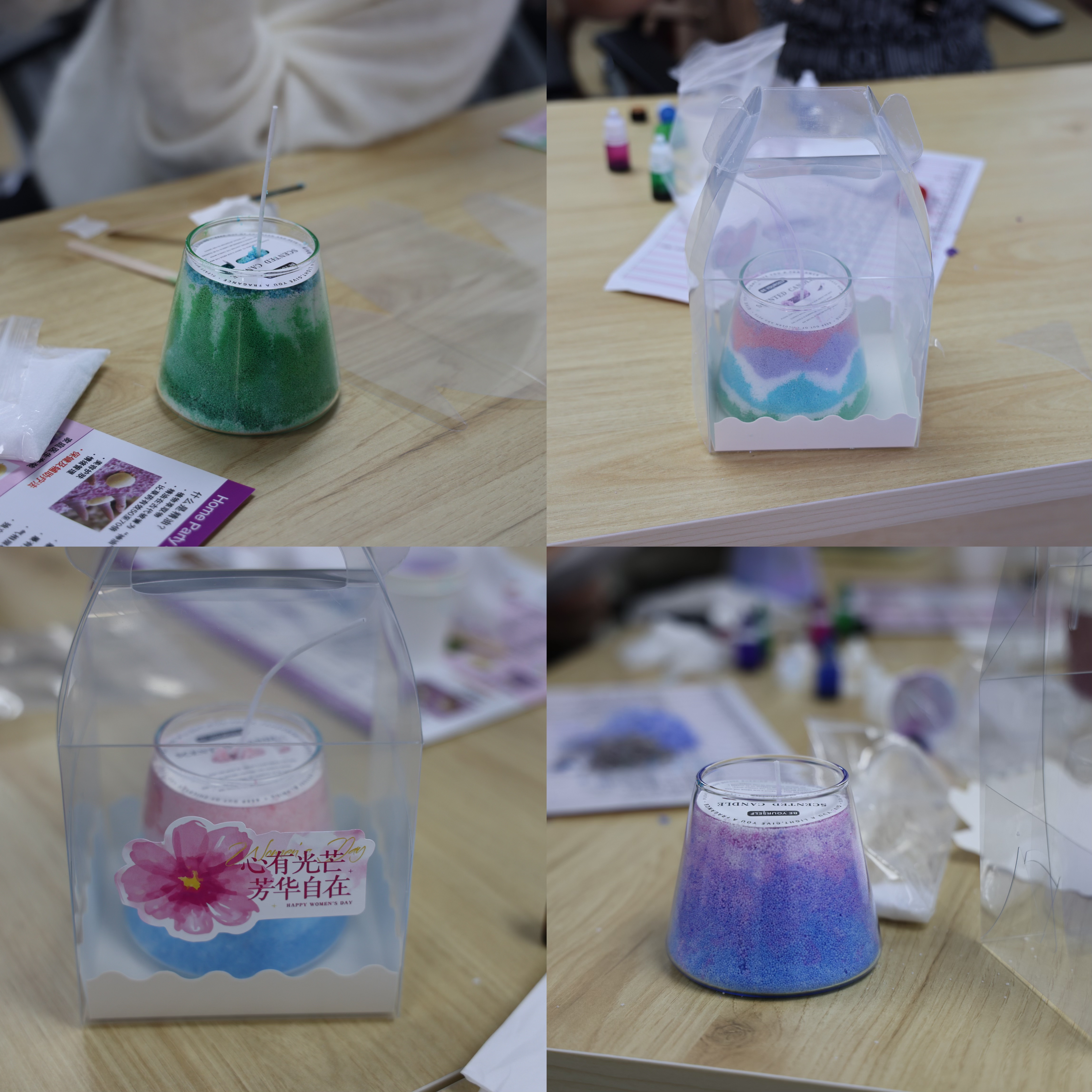 活动接近尾声,老师们纷纷做出了各式各样美丽的香薰蜡烛。老师们表示,这次活动不仅学会了沙画香薰蜡烛的制作技巧,更在忙碌的生活中找到了片刻的宁静与放松。同时,通过亲手制作香薰蜡烛,她们也将自己的祝福与爱意融入其中,寄托着对美的追求和对生活的热爱。