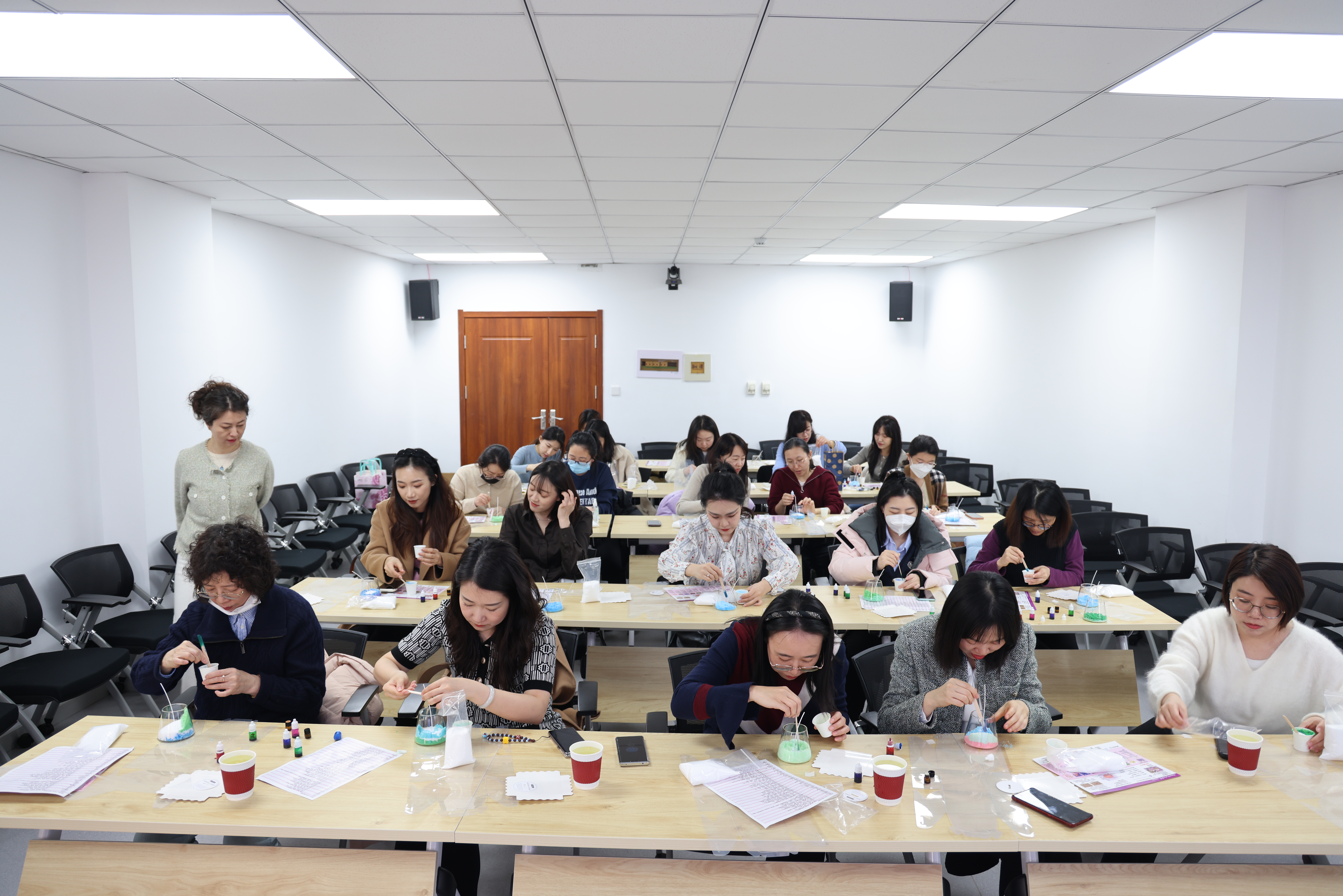 在实践环节,老师们纷纷化身“调香师”,精心挑选心仪的颜色,向容器内细心注入各种颜色的大豆蜡,将创意注入每一件作品,展现独特匠心。活动现场欢声笑语不断,愿这份春日的香气与温暖,伴随每一位“她”书写更美的岁月诗篇。